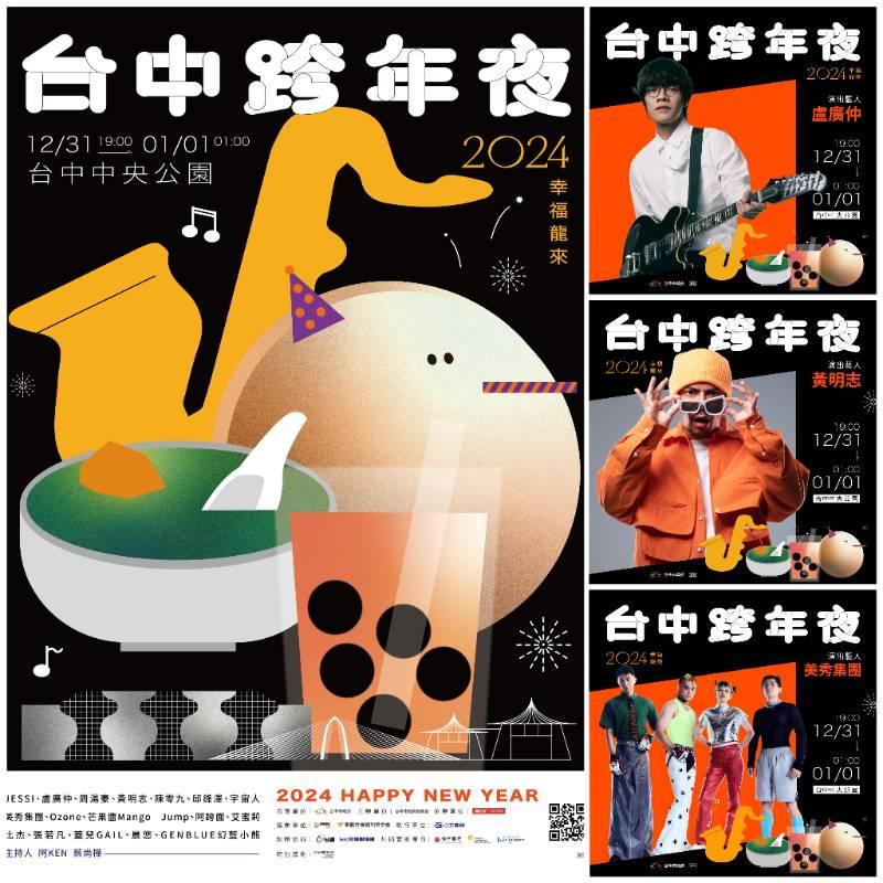 市府新聞局表示,除了滿足市民朋友的願望, 成功邀請到國際級重磅藝人到臺中演出外,這次臺中跨年晚會的主視覺,特別加入臺中特色元素,包括太陽餅、薩克斯風、麻薏和臺中發源的「珍珠奶茶」,可愛又不失設計感,以濃濃的地方味、向世界行銷臺灣的第2大城!
