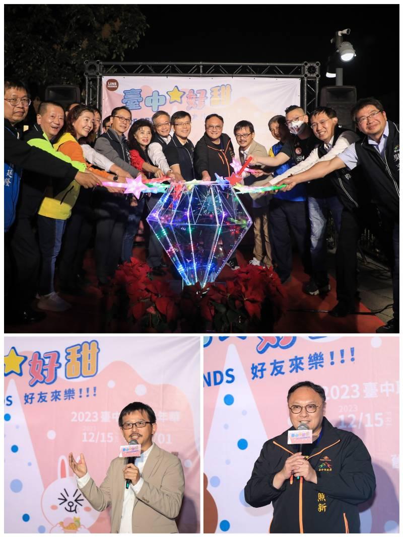 【大成報記者蕭宇廷/臺中報導】 2023台中耶誕嘉年華將於12月15日正式開跑,12日晚試點燈,LINE FRIENDS熊大兔兔的「珠寶盒劇場」首度展演,璀璨水舞燈光秀搭配耶誕樂啟動,瞬間點亮中區,讓人驚豔無比!台中市政府新聞局長鄭照新表示,台中今年首度邀請LINE FRIENDS好友們,參加台中耶誕嘉年華,期待藉由它們的高人氣與擴大展區,讓參觀人潮再創高峰、帶動周邊經濟振興舊城區,誠摯歡迎全國民眾到台中!