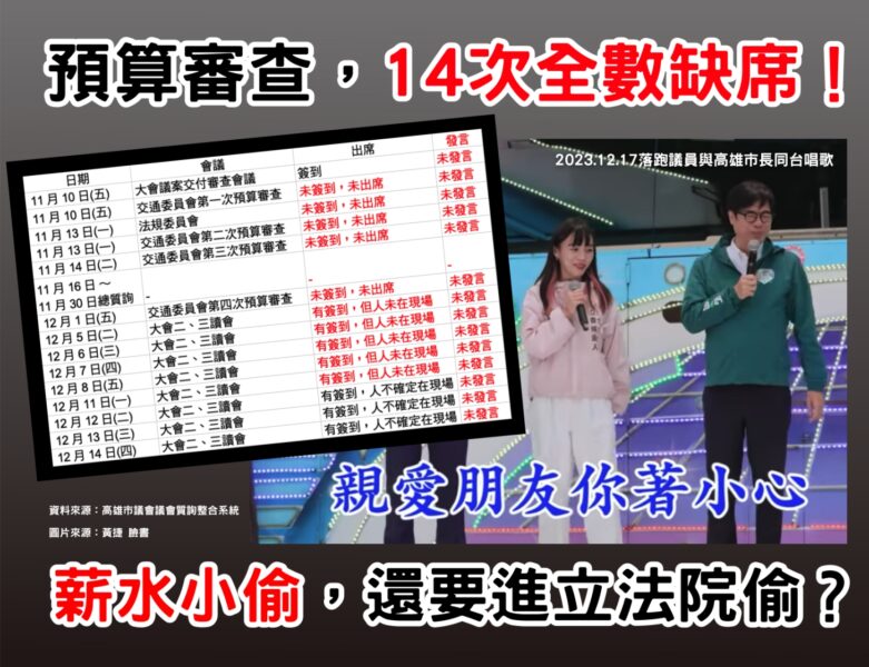 議會預算審查,14次會議竟全數缺席!林于凱痛批黃捷是「薪水小偷」!