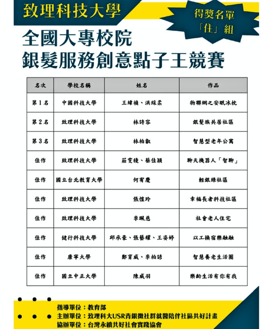 「全國大專校院銀髮服務創意點子王競賽」共有83所學校參與,總共有203件投稿。在經過激烈的評選後,最終選出60組得獎者;其中,中國科技大學資工系王緯禎、洪綵柔、顏湘芸、林智賢與李梓豪同學,發揮創意,在全國大專校院銀髮服務創意點子王競賽中,分別在「住」組獲得第一名,以及「衣」組獲得佳作。