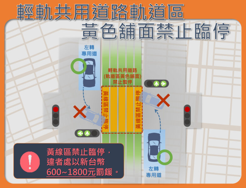 捷運局表示,近日有發現用路人不熟悉法規,經常違規於輕軌共用道路路口軌道區黃色舖面臨停等待左轉,造成輕軌車輛無法順利通行營運,影響輕軌營運安全及旅客乘車權益,特別提醒用路人倘違規於輕軌共用道路路口軌道黃色舖面區臨停等待左轉,警察執法單位將依違反道路交通管理處罰條例第48條第二款規定,不依標誌、標線、號誌指示處新臺幣600元以上1,800元以下罰鍰,請用路人務必遵守道路交通號誌、標線及牌面等指示行駛,以免受罰。