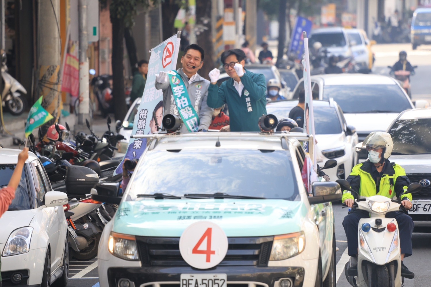 高雄市長陳其邁陪同民進黨左營楠梓立委候選人李柏毅進行車掃,並向市民懇託支持會做「④」的立委,將李柏毅送進國會。(記者翻攝)