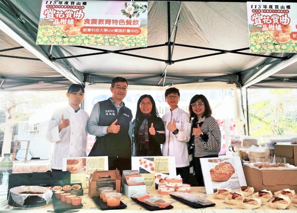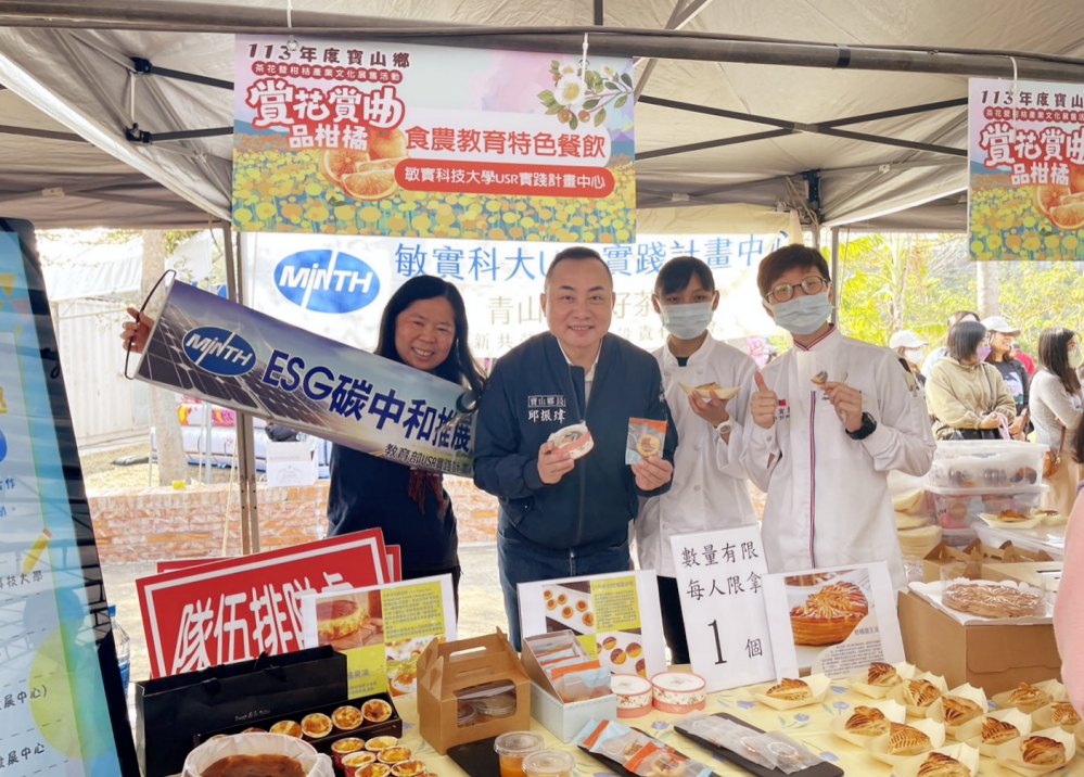 竹縣寶山鄉於日前(1/6)舉辦茶花暨柑橘產業文化節,風和日麗冬陽宜人適逢週末,寶山鄉深井村茶花柑橘展售中心現場,迎來許多貴賓以及遊客共同參與。寶山鄉柑橘與茶花發表活動,除有賞花品柑與欣賞崑曲,還有敏實科技大學USR實踐中心的ESG碳中和推展. 校長曾信超表示,敏實科技大學全力推廣永續城鄉低碳減塑,與餐飲管理系柑橘加值入味,推廣烘焙系列產品的製作與分享品賞。