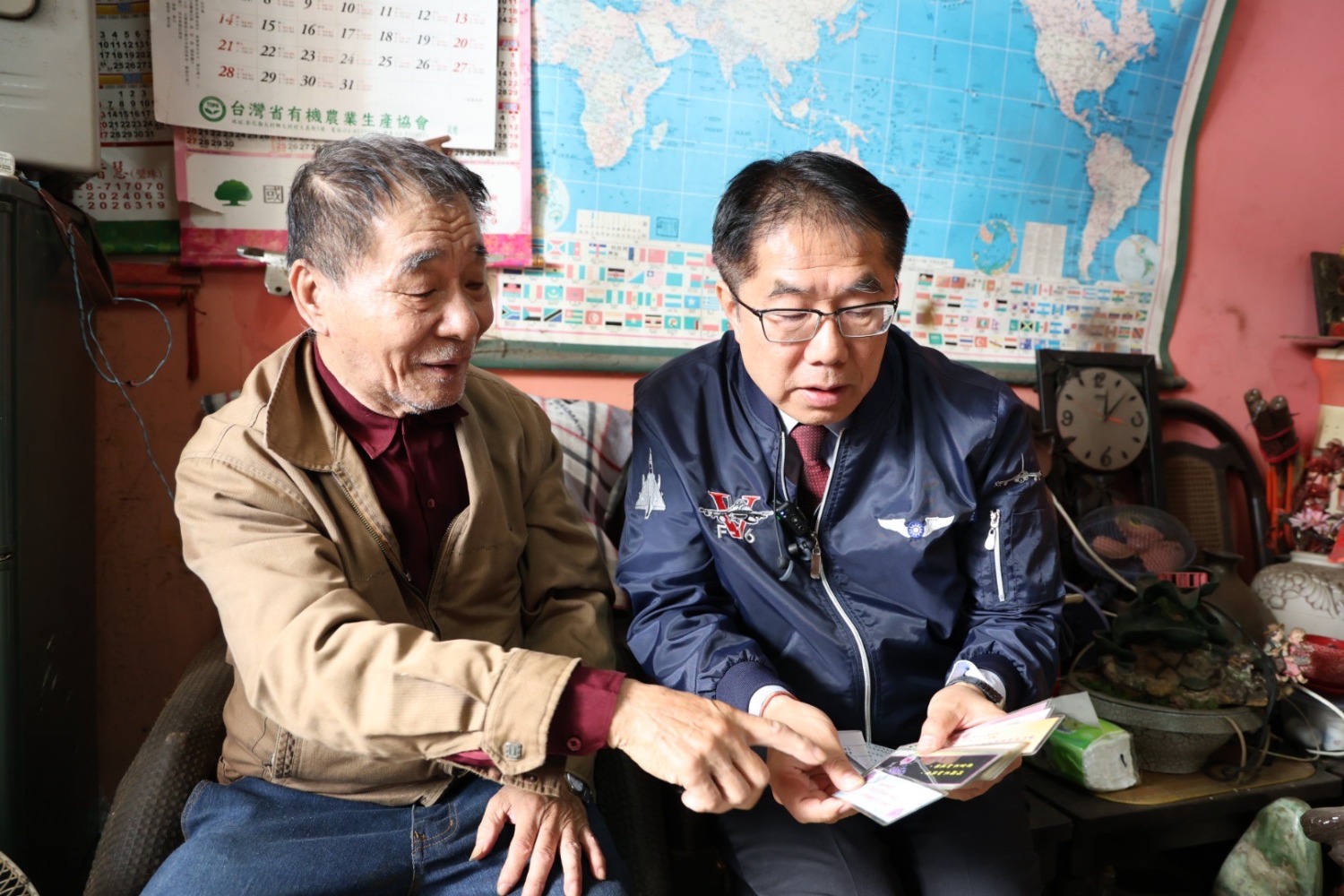 台南市長黃偉哲前往獨居長者楊明旺家中訪視,並親手送上羽絨外套、手套、毛帽及圍巾等禦寒衣物。(台南市政府提供)