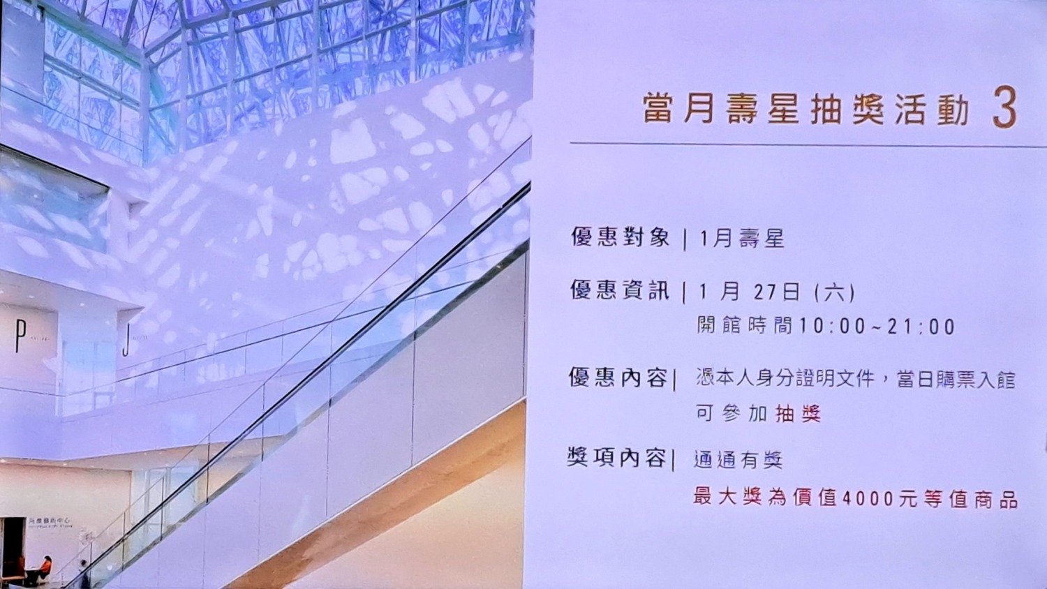 活動內容: 1月份生日壽星購票入館後憑本人身分證明文件,可參加摸彩抽獎。