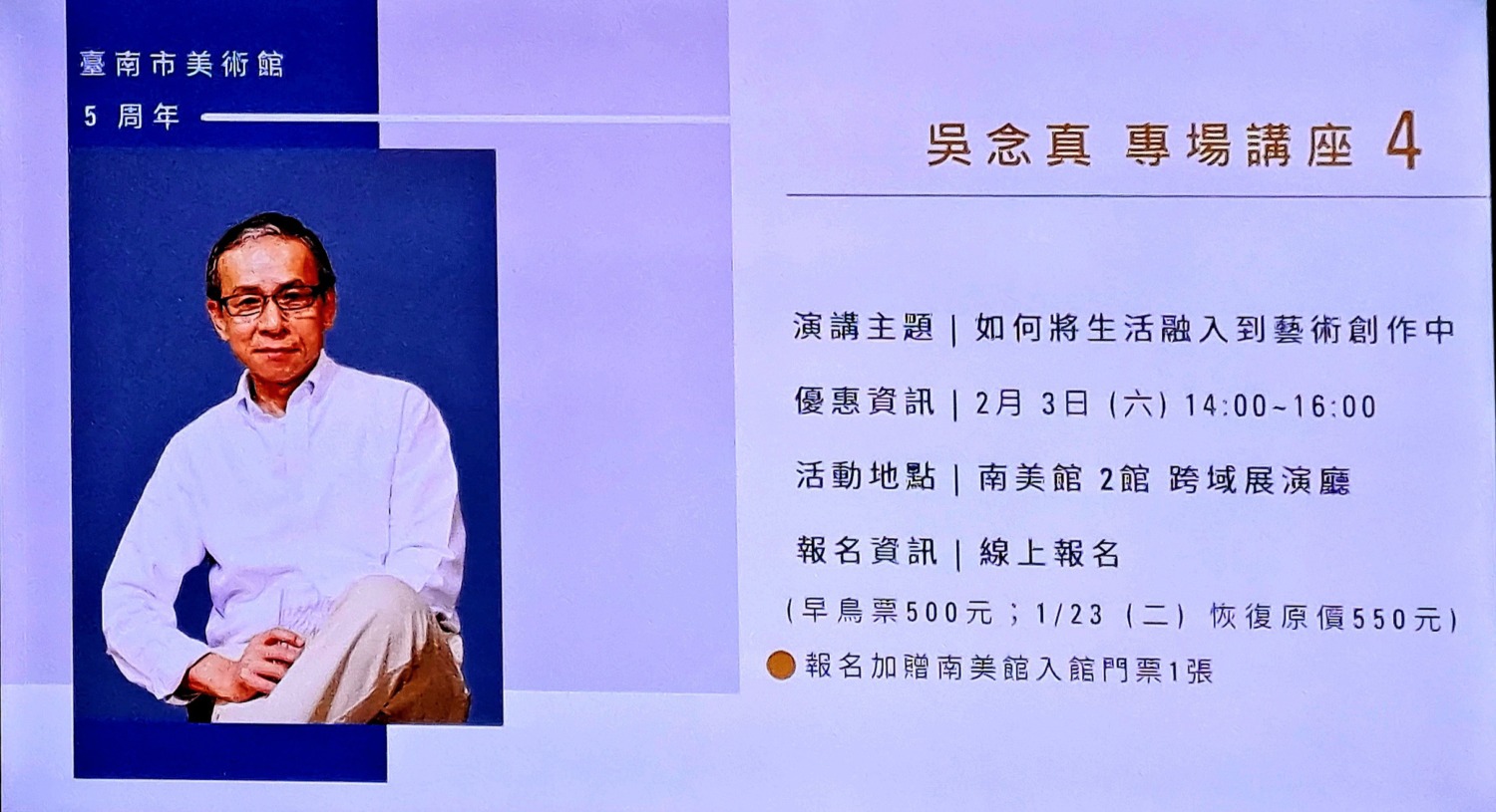 除與當代設計師合作,南美館榮幸請來臺灣首位榮獲金鼎、金鐘、金曲、金馬等4金殊榮跨界藝術大師吳念真導演,在2月3日週六為民眾帶來精采講座,講演題目為「如何將生活體驗融入到藝術創作中」;吳念真導演無論是電影或劇場的劇本創作,尤其是舞台劇《人間條件》系列總是因為貼近民眾生活日常而引發共鳴且感動人心;南美館為展示靜態藝術創作場域,展覽中所呈現藝術創作,也希望能夠觸動觀者生活經驗而獲得溫暖力量;希冀藉由大師分享,引領喜歡或有興趣進行各形式創作民眾找到方向,感受生活、激發創意。