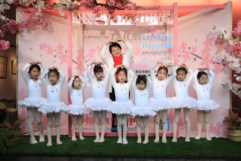圖說:盧秀燕與表演孩童於打卡牆合影。(記者張亞痕攝)