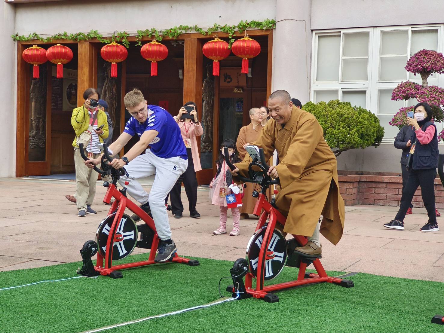 圖/佛光山2024年春節平安燈法會自行車動力發電的花燈,象徵追隨大師足跡的精神