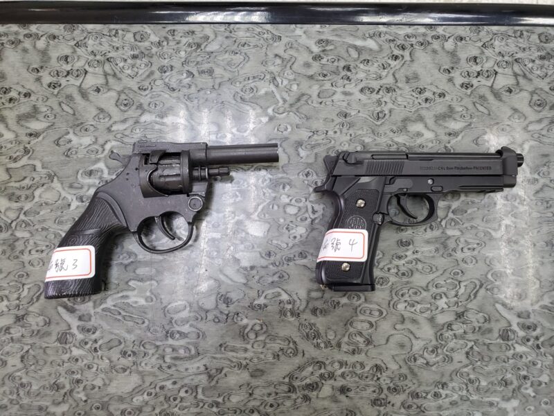 經警方持搜索票,為確保執行安全,並避免楊嫌持械逃逸反抗,特別於拂曉時段出擊執行搜索,前往臺中市南屯區楊嫌屋內一房間內發現有多把玩具槍,並有以紙箱作為靶紙射擊情形,經檢視各槍枝有一把疑似為模擬槍、一把左輪槍有改造及轉輪破損情事,又於桌上發現毒品吸食器及藏匿在菸盒內的一小包安非他命(毛重0.4公克),依持有第二級毒品當場將犯嫌逮捕,該2把手槍經鑑驗,其中一把為公告查禁之模擬槍,於113年1月份依槍砲彈藥刀械管制條例第20條之1予以裁罰及沒入在案,另一把有改造情事,惟已破損無殺傷力。