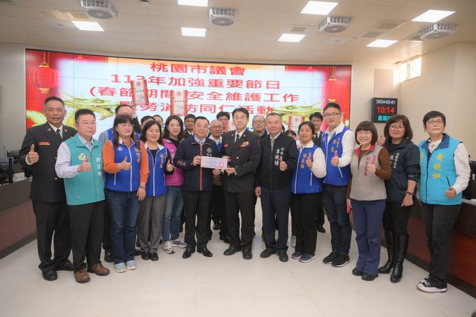 【News586/記者彭慧婉報導】春節假期即將到來,桃園市政府於今(1)日開始,展開為期15天的「春節安全維護工作」。桃園市議會議長邱奕勝及副議長李曉鐘,今早率領議員同仁前往消防局及警察局親自慰問辛苦的警、消同仁,並致贈慰勞金感謝大家的無私奉獻,辛苦值勤。