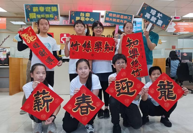 【勁報記者于郁金/臺南報導】找工作開心過好年,勞動部勞動力發展署雲嘉南分署台南就業中心除辦徵才活動,更增添濃厚過年氣氛;邀公益團體助陣鬥鬧熱,2月2日邀請臺南市音樂大賽冠、亞軍國樂好手組成「知樂絲竹」國樂團開場演奏,及勵馨基金會、財團法人更生保護會、社團法人台南市玉山原鄉全人關懷協會等團體設擹,提供年貨品嚐、二手物資採購體驗、更生人創業分享;並加上書法名家吳福山老師現場揮毫送春聯、就業獎勵燈謎猜猜等濃濃年節活動,吸引近百求職朋友參與;現場隨處可見紅色春聯及播放年節歌曲祝福求職朋友龍年順利好運一整年。