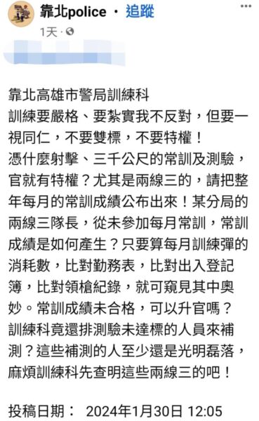 【今傳媒/記者張淑慧 報導】高雄市警局訓練科疑因常訓課不公,引起基層員警積壓已久的不滿。員警於臉書《靠北police》PO文直指,射擊及常訓測驗成績的不公,未見一視同仁原則。其中位於市中心某分局的兩線三隊長不參加每月常年訓練,遭質疑常訓成績是怎麼出來的? 常訓成績不合格者,可以升官嗎? 訓練科只排測驗未達標的人員來補測,這只是走個程序,然這些補測夠光明磊落嗎?有雙標及特權?籲將常訓成績公開透明化,以確保升遷過程的公正性。