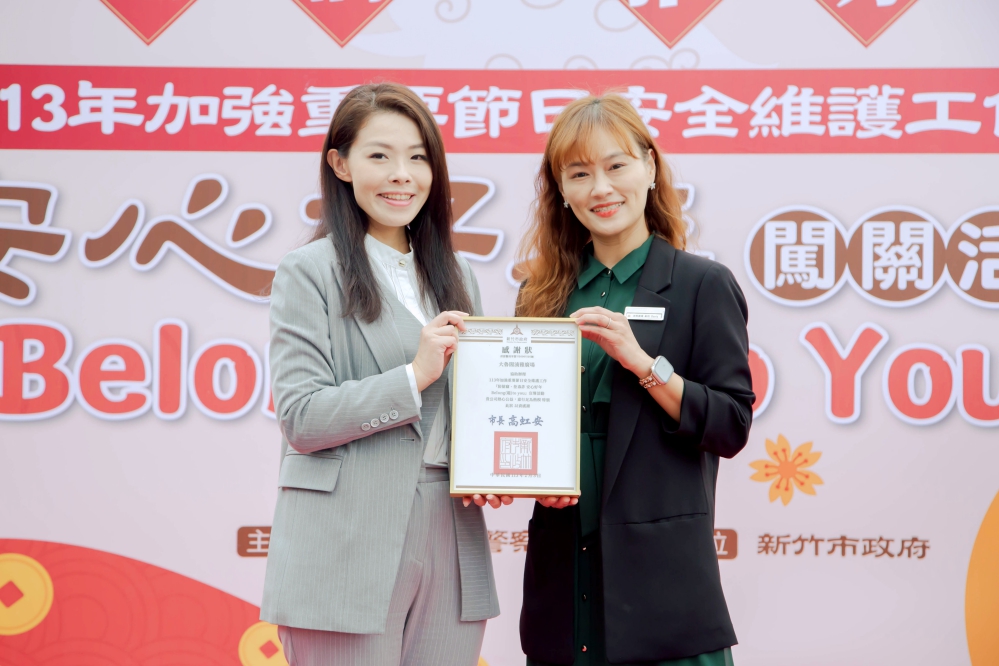 ▲竹市警察局舉辦「防搶竊.拒毒詐.安心好年Belong(龍)to you」犯罪預防宣導闖關活動。竹市長高虹安(左)致贈感謝狀予大魯閣湳雅廣場副店長。(圖/竹市警察局提供)