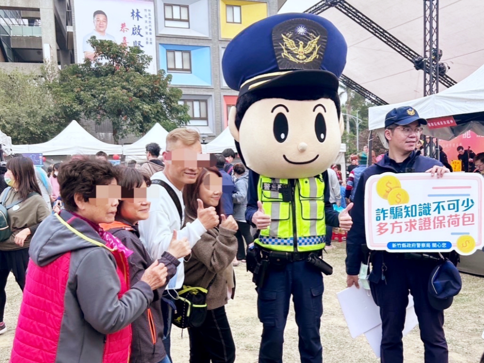 竹北警分局放大絕宣導反詐預防犯罪 攜手「波麗阿助」嗨翻年貨大街送好運龍來紅包袋