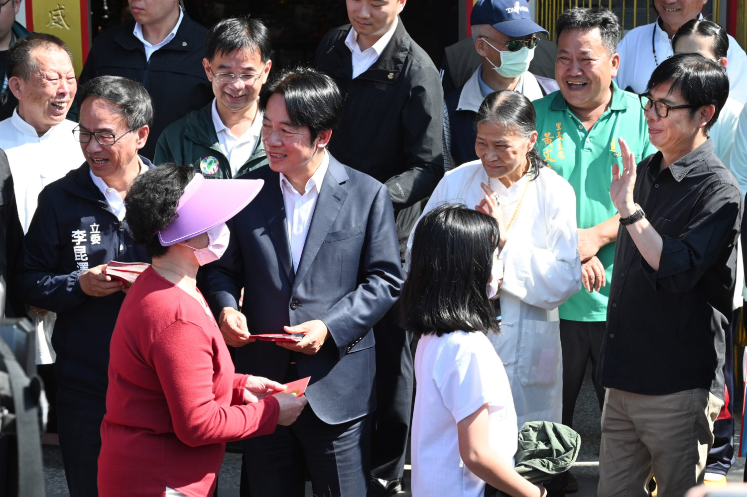 今天是2月14日大年初五,也是春節連假最後一天,高雄市長陳其邁、在地立委許智傑、李昆澤、議長康裕成及多位議員,陪同副總統賴清德前往五甲龍成宮及覆鼎金道德院參香、發放福袋。陳其邁代表市民歡迎賴副總統,也就是總統當選人賴清德蒞臨高雄,相信未來在賴清德領導下,台灣可以風調雨順、國泰民安,陳其邁不忘邀請民眾參與下午的小鴨遊港活動,見證高雄十年來的蛻變。