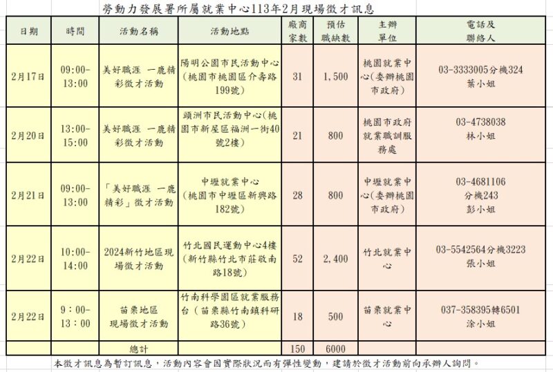 ▲桃竹苗分署2月份在桃園、中壢、新竹、苗栗等地區辦理5場徵才活動。(圖/桃竹苗分署提供)