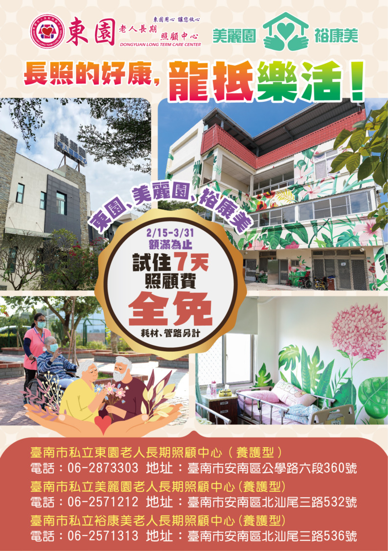 春節過年是傳統重大節日,採買年貨、除舊布新,全臺各地為了迎接新的一年而忙碌熱鬧,但是對於家有長輩需要照顧的家庭來說,年關到來壓力卻是加倍,因為長照服務可能因為過年暫停,照顧者就要一肩擔起全部的責任,再加上照顧一整年的勞累累積,造成壓力指數爆表!甚或有些長照家庭希望年終越多越好,年假越短越好。臺南市是高齡友善城市,連年在長照方面的成績都居全臺之首,樂活集團為大臺南區優質長照業者,響應政府對高齡弱勢的照顧政策,旗下所有提供喘息服務的住宿型機構,今年春節期間喘息服務不打烊,而且為了迎接龍年新氣象,東園長照中心、美麗園長照中心、裕康美長照中心更是推出早春優惠,試住七日免照顧費的好康放送,對於長照照顧家庭來說,不啻是一大福音。