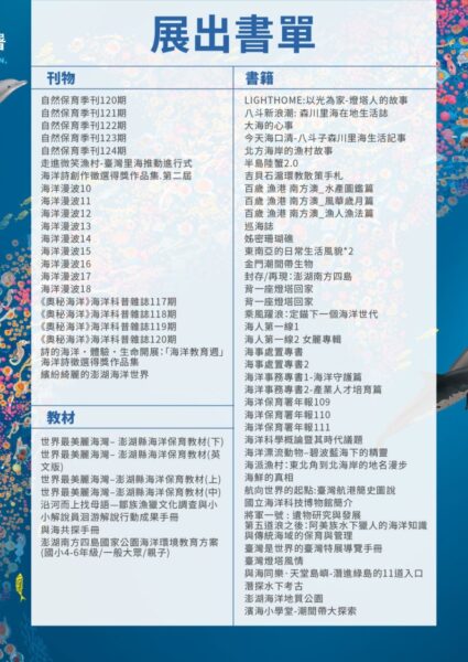 海保署指出,在大小朋友都喜愛的「繪本」專區,除了臺灣鯨讚、小海龜的逆襲、珊瑚手鍊之謎、守護大海的人等,現場還會播放「小浮游的遠行」動畫;另外在「海洋文史類」專書包含大海的心事、航向世界的起點-臺灣航港簡史圖說及第五道浪之後-阿美族水下獵人的海洋知識與傳統海域的保育與管理等;於「里海日誌」專區則有巡海誌、走進微笑漁村-臺灣里海推動進行式及八斗新浪潮-森川里海在地生活誌等;最後在「攝影集」專區則展出你眼中的海攝影集、環礁秘.靜-東沙攝影集及他鄉‧故鄉-澎湖南方四島紀行等。