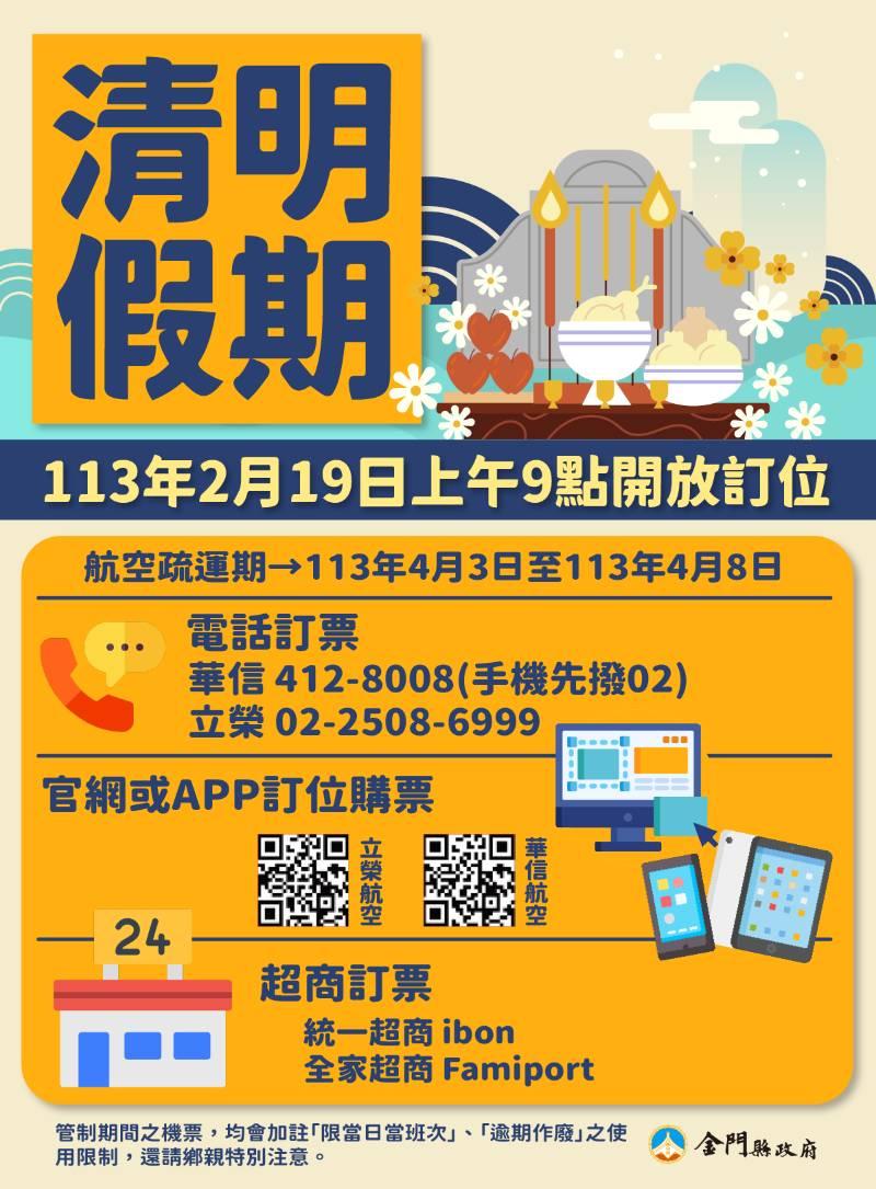 金門縣府提醒鄉親旅客,此次清明連假,於尖峰時段113年4月3日至5日臺灣出發往金門方向,及113年4月6日至8日金門出發回臺灣方向之機票,均會加註「限當日當班次」、「逾期作廢」之使用限制,以使有限之空運資源獲得更有效之利用;旅客如因故無法搭乘原訂航班時,務必於航班起飛前通知航空公司取消訂位,並依原機票規定辦理退票,以維護自身之權益。