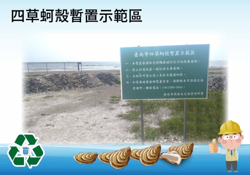 黃偉哲市長指出,為了處理蚵殼問題,市府農業局於111年7月在臺南安南區四草海岸設置了四草蚵殼暫置示範區,佔地3580平方公尺。112年1月取得了土地所有權,同年8月完成了示範區設施的建設工作,開放給養蚵的漁民將蚵殼運送至該區暫存。農業局還於112年辦理了蚵殼標售工作,以每噸200元的價格售予得標廠商。截至112年,已售出10.42公噸蚵殼,所售出的蚵殼交由台灣糖業公司的台糖生技材料廠加工製成蚵殼粉,再交由下游廠商生產各種商品。