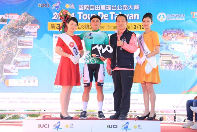 (記者林明佑/台中報導)2024國際自由車環台公路大賽於3月10日至3月14日舉行,今(12)日賽事進入第3站「浪漫台三線站」,行經新竹縣、苗栗縣與台中市,台中市政府副秘書長張大春代表台中市長盧秀燕出席頒獎典禮。賽事全程以多國語言在Youtube平台直播,記錄台三線質樸客庄風貌與在地熱情,行銷台中客庄風情,讓台中魅力躍上國際!