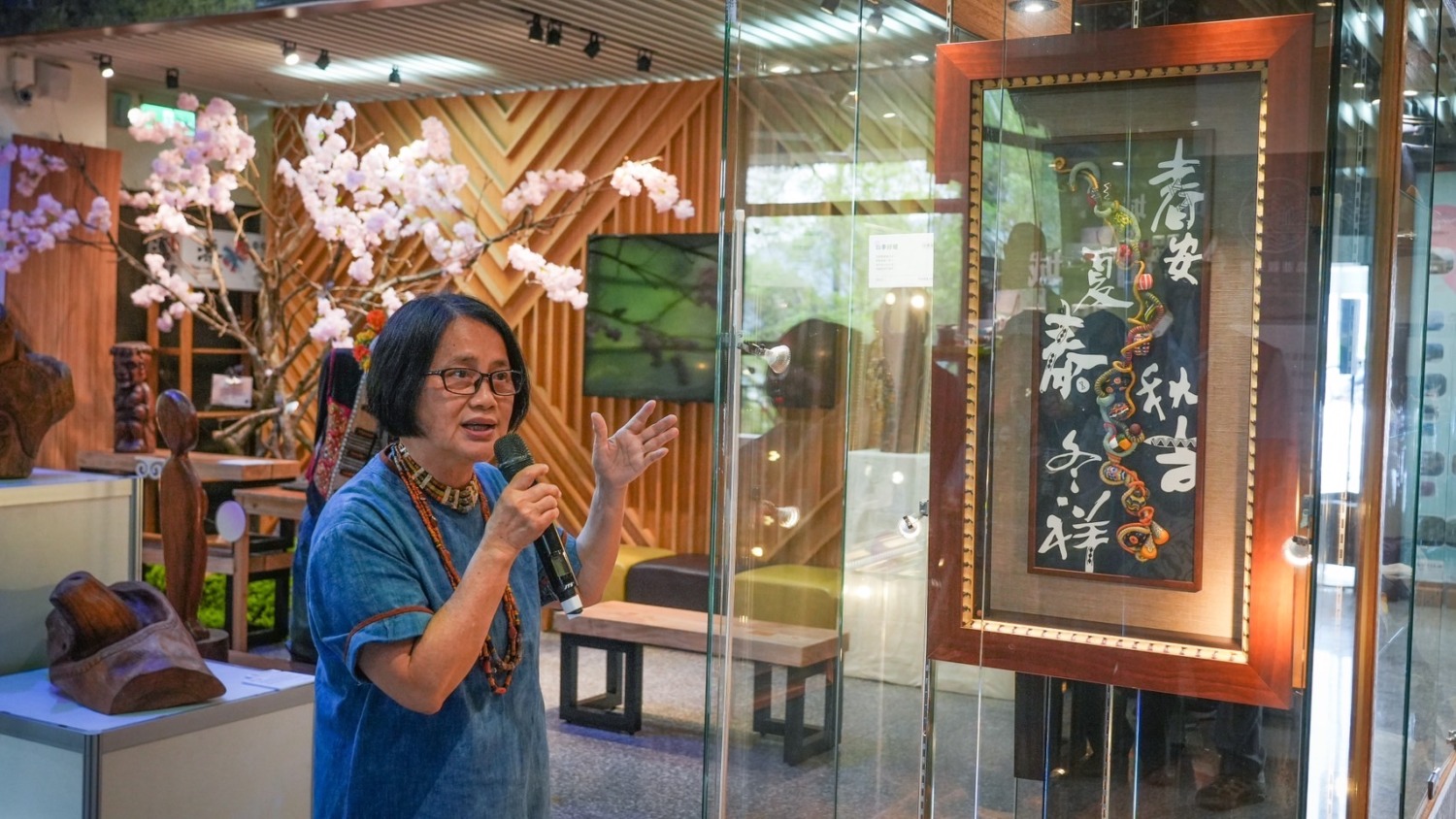 施秀菊,排灣族人,生於屏東三地門鄉三地村。她創立了蜻蜓雅築珠藝工作室,自1983年起致力於推廣排灣族琉璃珠文化。她不僅重現了傳統的古珠藝術,還將現代女性的靈思情感融入其中,創作出獨特的新式琉璃珠作品,為部落文化的傳承和發展做出了重要貢獻。本次展出【煥發勇士魂】、【吉祥如意】、【喵】、【風林舞起】、【四季好禮】等多項作品,呈現琉璃文化的氣息。