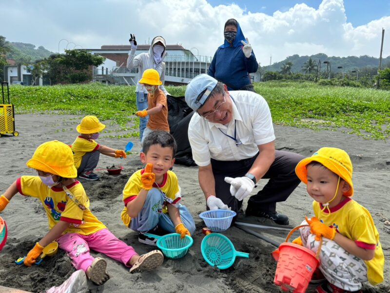 拿鏟子、握濾網,重複濾篩沙灘上的土砂,微塑膠一一浮現眼前、無所遁形。國立中山大學員工子女非營利幼兒園鄧筱蓉園長指出,此次活動內容,主要從近年來愈發被重視的「海洋廢棄物」議題出發,由海資系副教授劉商隱至班上講授,藉由認識塑膠垃圾(微塑膠)與其影響增進園內教保服務人員與園生對海洋塑膠污染的了解,並將知識帶入實作中,讓幼生認知無塑的重要性;透過小孩的傳遞,形成家庭網絡,提倡「家庭無塑日」,一起落實減塑、無塑新生活。