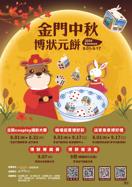 此外,博餅鄉鎮賽將於9月7日於各鄉鎮同步展開,博餅總決賽也將於9月下旬舉辦,相關訊息請參考「2024金門中秋博狀元餅」活動官網(https://event.jwimarketing.com/kinmen_2024/)、金門觀光旅遊網(https://kinmen.travel/),或以手機掃描行動旅服QR code。(飲酒過量,有害健康,禁止酒駕)(未成年請勿飲酒)