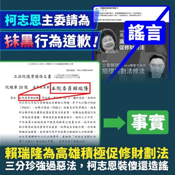 賴瑞隆強調,早在今年2月27日提出《財政收支劃分法》修法版本,是全立法院第一個提案的立委,並表示支持修法給高雄合理的分配比例,以實現區域均衡及公平正義。但柯志恩及高雄黨部抹黑造謠,然而在記者會中,對抹黑卻戲謔帶過,不思檢討反省。