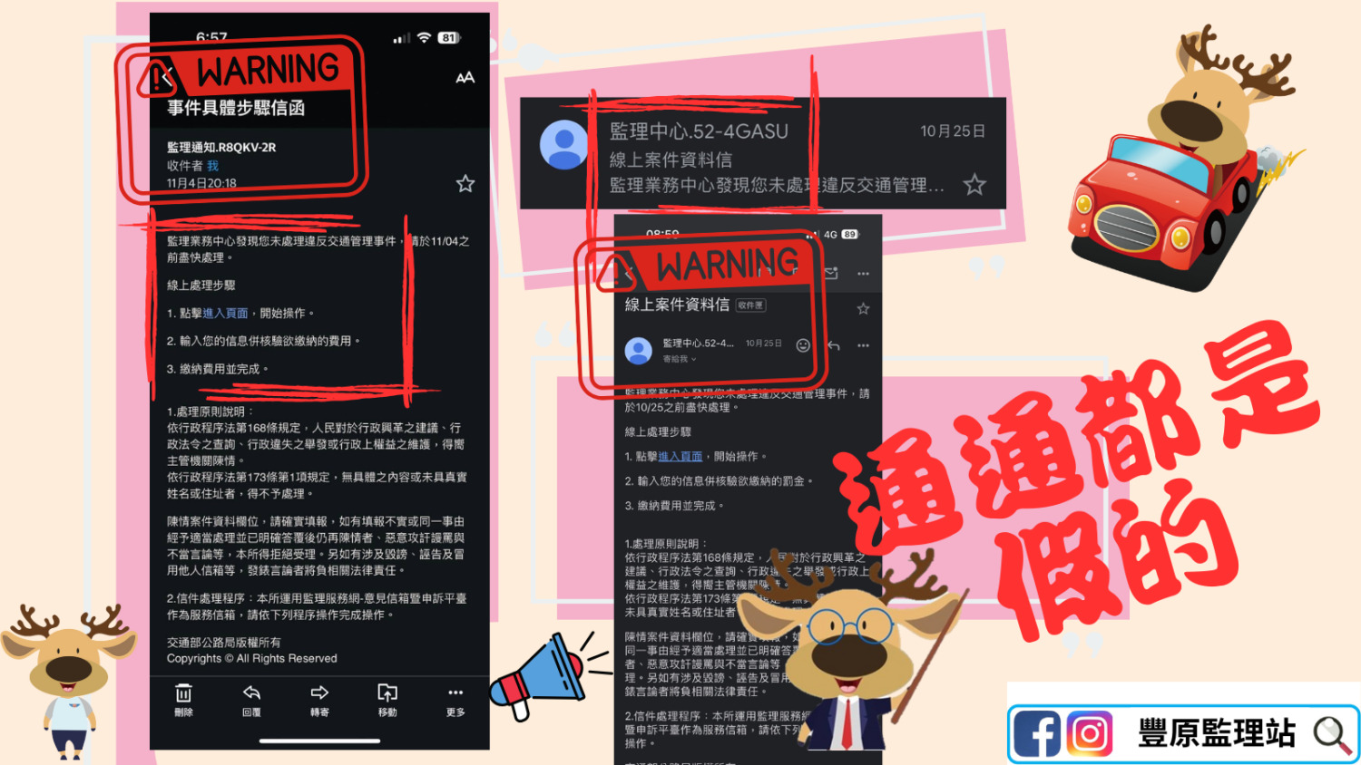 豐原監理站表示,陸續有民眾反映收到假冒政府機關發送之「未處理之交通違規」或「交通違規罰鍰未繳」的電子郵件或簡訊,誘騙民眾連結至不明詐騙網站鍵入相關資料,經查證該電子郵件或簡訊所載網址非「gov.tw」結尾,不屬於政府機關網址,是假訊息!民眾若收到這類詐騙簡訊,請不要點選,以免荷包失血。