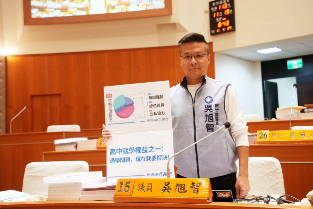 新竹縣議會第20屆第4次定期會總質詢,縣議員吳旭智今(11/19)日關心AI園區交通、台大校區進度、警車保險、公車不足、轉運站規劃、特教助理員、高中經費進度、超額比序入學、YouBike使用量及友善自行車環境等議題,期盼竹縣大眾運輸會更好,達到共榮。