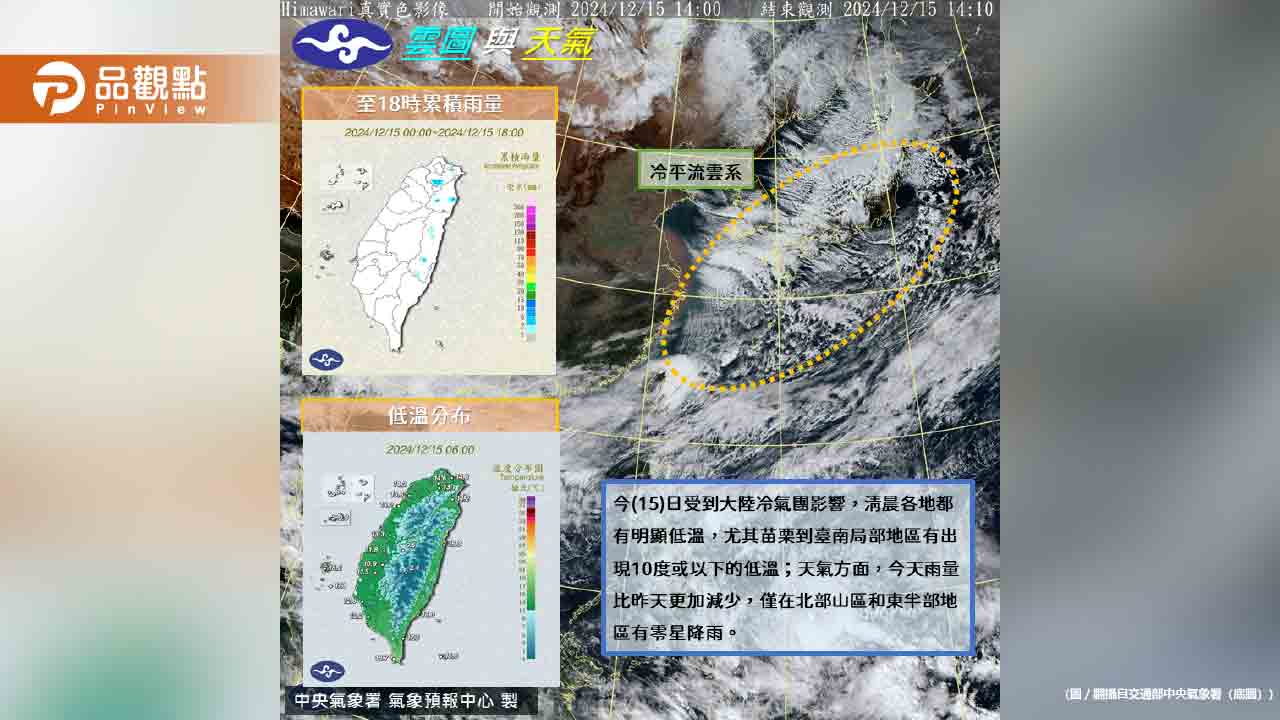 氣象署表示,受到東北風及南方雲系北移影響,今日北台灣、東半部和南部地區有局部短暫雨,其他地區為多雲到晴的天氣。白天各地高溫約在17至21度之間,体感較為涼冷。