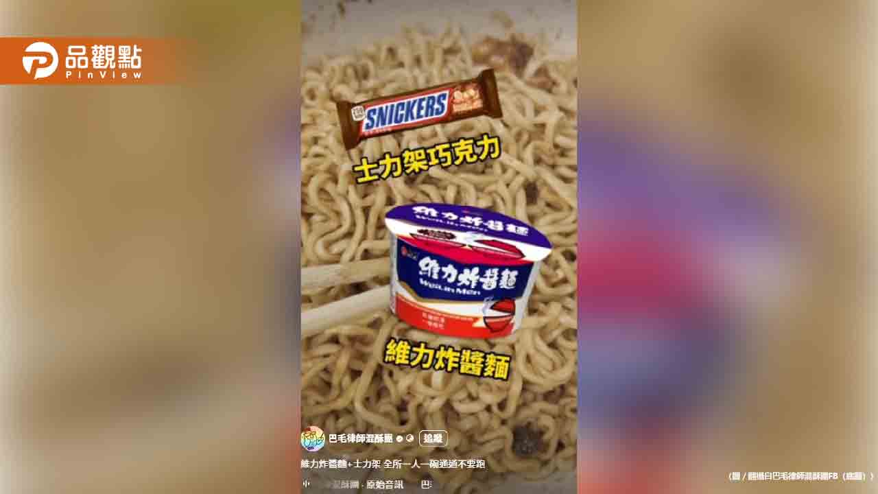 面對這樣的話題,身為網紅的巴毛律師決定找律所的同事們一起品嚐這個特殊的組合。他們選用的是XL款的維力炸醬麵,並加入約三分之二條的士力架巧克力,將巧克力放入微波爐加熱融化後,與炸醬麵充分拌勻。
