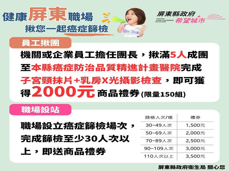 多數國人一天有超過三分之一時間處於職場,「職場」是推動國人健康重要的場域,屏東縣政府衛生局關心職場員工健康,特別規劃「健康屏東職場揪您來癌症篩檢~享好禮!」獎勵,透過揪團方式(揪滿5人成團) 完成子宮頸抹片及乳房X光攝影篩檢,或勞工事業單位主動參與癌症篩檢,就可獲贈獎勵禮券,透過實質獎勵方式提升職場員工防癌認知及定期篩檢習慣,建立良好的企業形象及員工健康之雙贏策略。