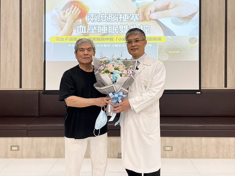 奇美醫院中醫部骨傷科主任任東輝舉例說明,72歲黃先生曾有兩次腦梗塞,時常因肩頸肌肉緊繃,持續疼痛導致夜晚難以入眠,血壓又偏高,白天疲累不堪影響正常生活,就醫後中醫師診察發現肩頸部肌肉非常僵硬,頸椎過度伸直,椎間孔狹窄,影響頸部往腦部的供血,每週進行1次小扁針療法,經過4週治療,肩頸部緊繃痠痛獲得緩解,晚上不再失眠,血壓也獲得穩定,目前時續治療中。