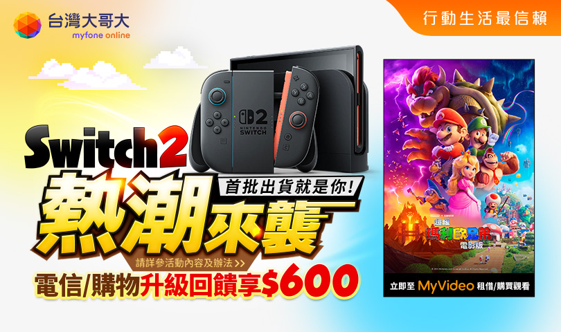 myfone網路門市除「大哥付你分期」回饋,618年中慶同步推出眾多好康,6月30日前於myfone網路門市申辦指定專案,或購物滿3888元,即可登記抽Switch2瑪利歐賽車世界主機組合(價值1萬5580元)。其中,若為續約5G專案且資費升級,加碼回饋最高3300元myfone online電子禮券與mo幣。