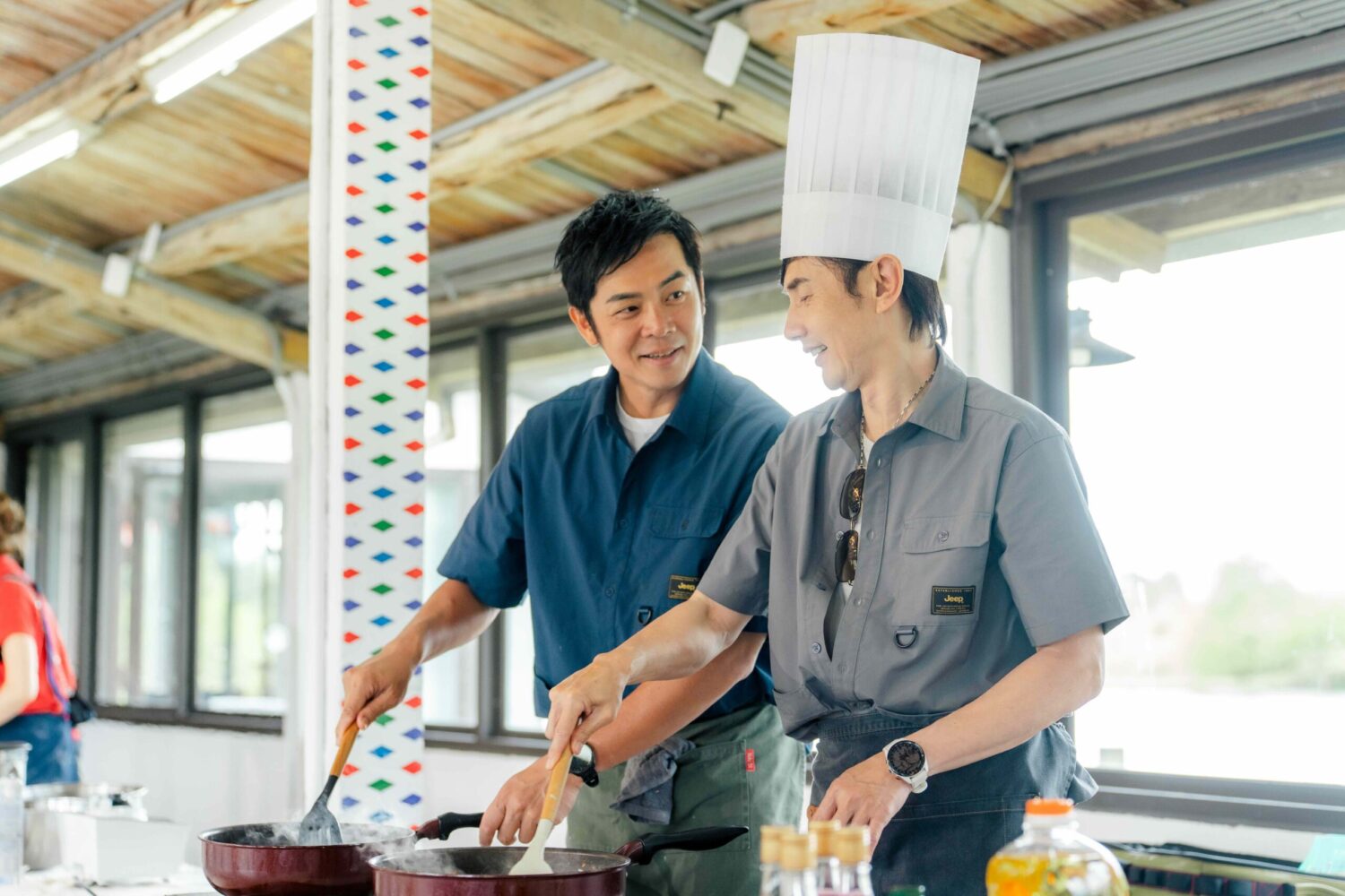 店長包偉銘(右)戴上廚師帽後展現驚人廚藝(左為)姚元浩 照片提供:好看娛樂