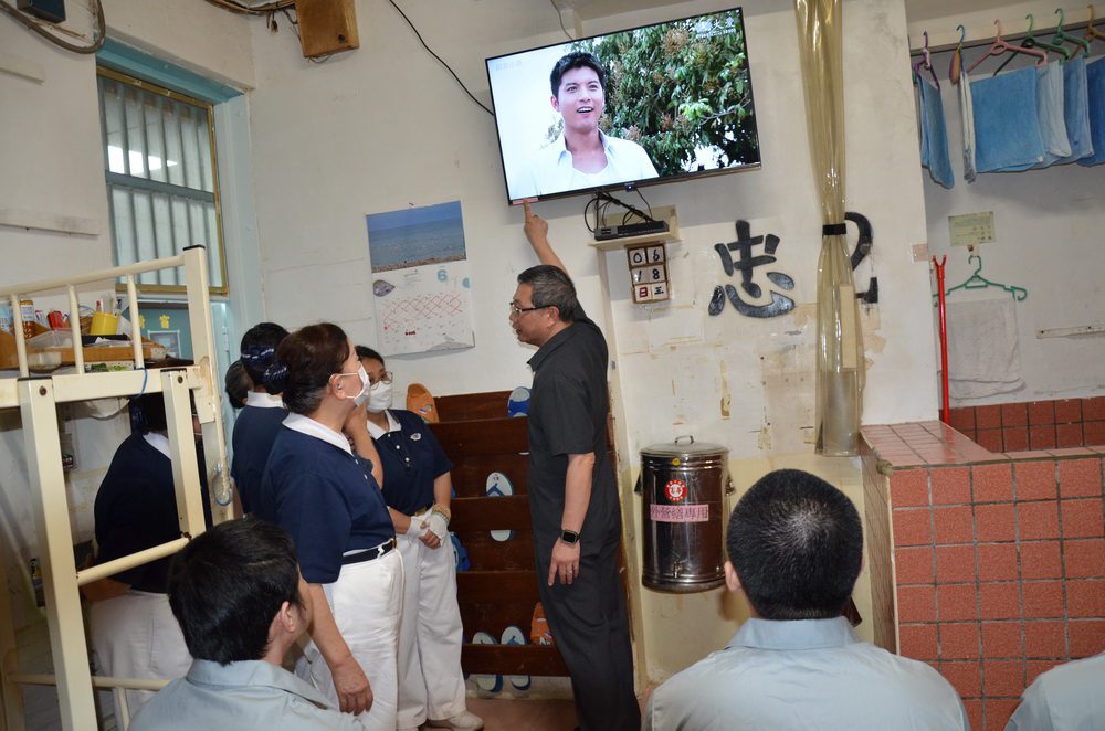 ▲典獄長黃正勇陪同財團法人慈濟傳播人文志業基金會一行人參觀安裝好電視的舍房受刑人收看情形。(圖/基隆監獄提供)