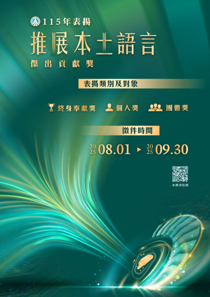 教育部115年表揚推展本土語言傑出貢獻獎自114年8月1日開始受理推薦,徵件至114年9月30日止(郵戳為憑),歡迎各界踴躍薦舉!讓長期為臺灣本土語言之傳承與發展奉獻心力的團體及個人獲得應有的肯定!