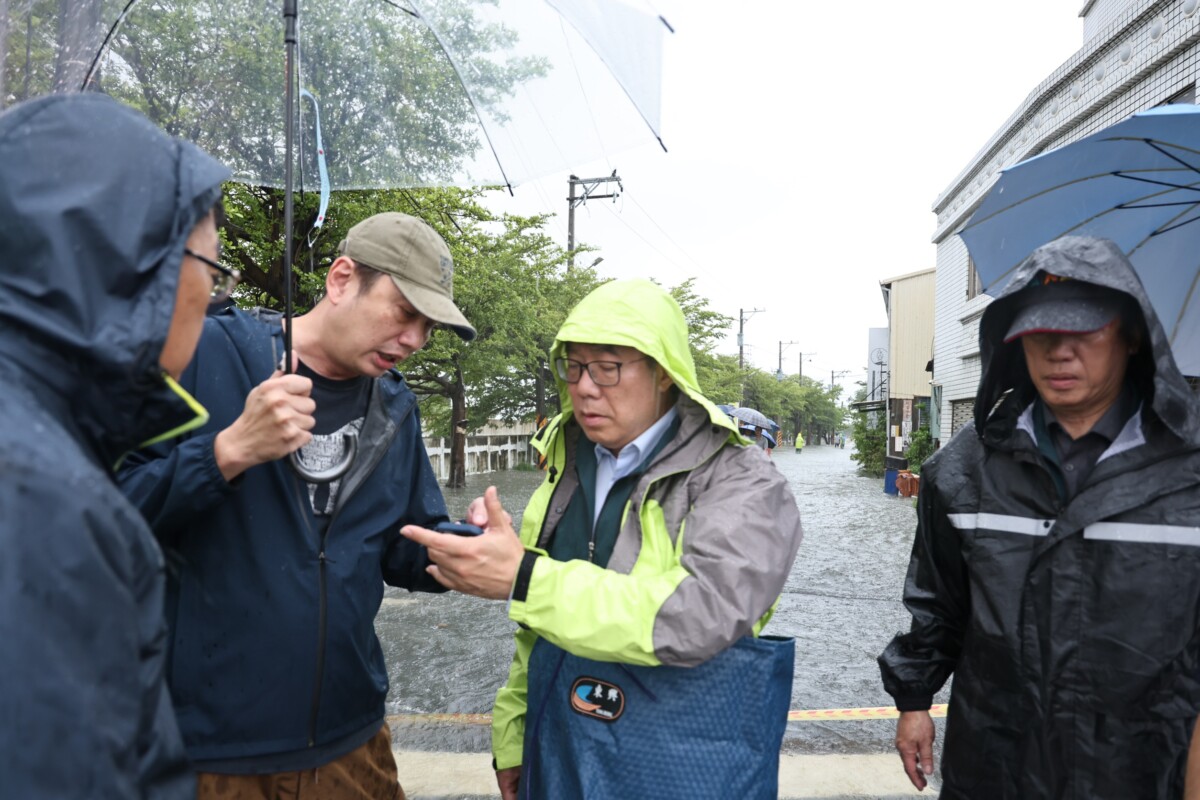 台南市長黃偉哲前往永康崑山科大周邊、仁德滯洪池瞭解當地災情後,隨即前往安南區北安路與培安路口周邊,視察積淹水情況。(記者翻攝)
