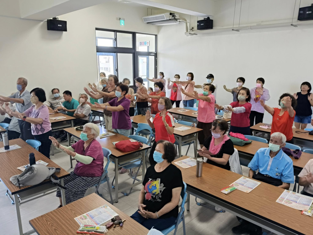 為提升課程參與度,活動特別設計簡單易學「肌少症運動」教學環節,讓長輩在輕鬆氛圍中學習強化肌力與平衡動作,進一步認識肌少症預防方式;課程介紹兩個實用動作:一是「站姿側抬腿」,雙手扶牆或椅背,大腿向側抬起、再慢慢放下,一邊10下、每日3組,可訓練大腿外側肌群、減少膝關節僵硬;二是「坐姿單腳抬腿」,坐在椅前緣、背部打直,單腳往前踢伸直到膝蓋打直、停留5秒後放下,同樣一邊10下、每日3組,有助強化股四頭肌、減輕膝蓋與骨盆壓力;提醒長輩運動應量力而為、循序漸進,避免受傷,才能有效預防肌力流失、延緩衰弱。