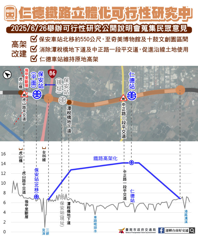 交通局表示,專業規劃團隊依據「鐵路平交道與環境改善建設及周邊土地開發計畫審查作業要點」,針對工程技術、交通改善、經濟效益、財務等面向進行分析評估,仁德區鐵路採高架改建較為可行,高架範圍北端起自台86線高架橋下,南端至港尾溝溪,長約2.6公里,沿線可消除潭稅橋地下道及中正路平交道,惟因現有保安車站位於鐵路高架斜坡路段,為符鐵路相關規範,須將保安車站北移約550公尺,平面車站新址規劃於奇美博物館及十鼓文創園區之間,後續車站可更新優化,提供當地更便利之公共運輸服務,現有之保安車站因屬市定古蹟,規劃原地保留後續可朝文化觀光用途發展;另仁德車站則可維持原地高架,鐵路立體化總經費初估約105億元。