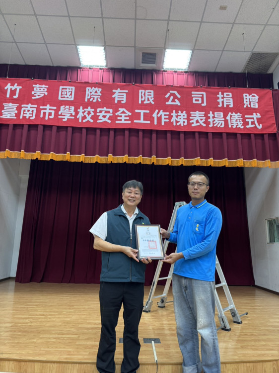 【大成報記者杜忠聰/臺南報導】為落實社會服務,支持教育發展與安全意識提升,竹夢國際有限公司創辦人施昌邑先生透過市議員王宣貿,以實際行動回饋地方,捐贈 61 座安全工作梯給南市新營區新營國小等 61 所學校,旨在增進校園環境安全。這次善舉既展現企業對社會的關懷,也體現對校園安全環境的重視。今(22)日,捐贈表揚儀式在南新國中舉辦,臺南市教育局長鄭新輝代表市長黃偉哲頒發致謝獎狀,受贈學校也到場參與,共同見證這有意義的時刻。