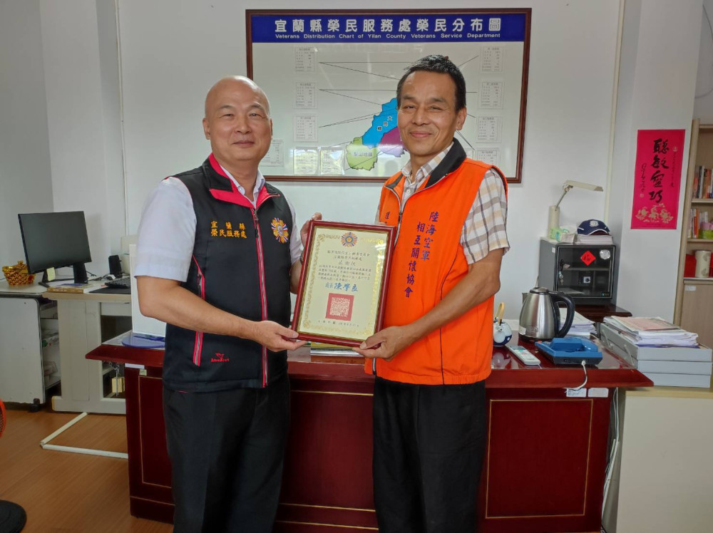 【勁報/宜蘭報導】25日陸海空軍常備士官班相互關懷協會李理事長明聰與其夫人董女士,由宜蘭分會長陳柏元陪同蒞臨宜蘭縣榮民服務處,處長陳學良特別藉此機會致贈李理事長感謝狀,感謝理事長及協會對於宜蘭地區弱勢榮民眷及遺孤之關懷與照顧。