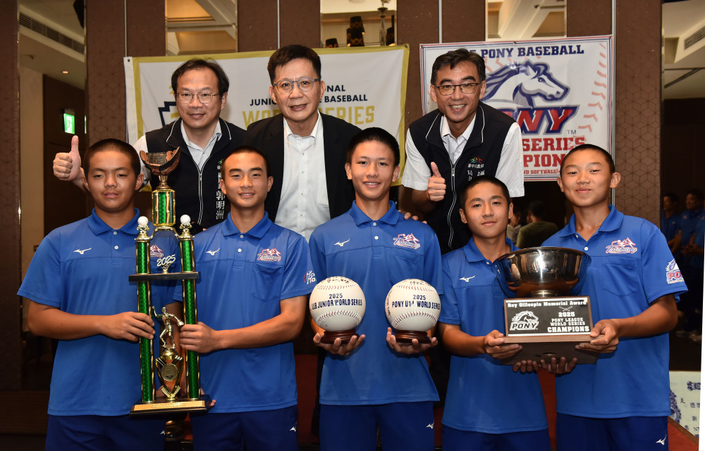 【 大成報記者蕭宇廷/臺中報導 】台中市青少棒小將勇奪雙料世界冠軍!中山國中棒球隊代表出征「2025 世界少棒聯盟(LLB)世界次青少棒錦標賽」;而由中山、向上、西苑及豐陽國中組成的中市青少棒代表隊,接續代表參加「2025 PONY小馬級世界青少棒錦標賽」,兩項賽事雙雙於美國賽場發揮頂尖實力、摘下世界冠軍金盃,創下台中市同年囊括LLB次青少棒與PONY青少棒世界賽冠軍的歷史紀錄。 教育部次長張廖萬堅表示,台中市的棒球真的是槓上開花,連得LLB、PONY雙料冠軍。真的要感謝中華民國運動彩券經銷商商業同業公會理事長何昱奇的慷凱解囊,說到做到提供了60萬的獎金激勵球員奪冠;希望在運動部成立之後,可以藉此讓台灣的運動在國際發光。