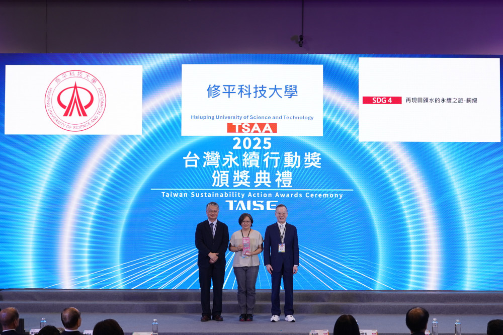 圖說:修平科大以「再現田頭水計畫」榮獲 2025 年台灣永續行動獎銅級,由計畫主持人李淑如老師代表受獎。(修平科大提供)