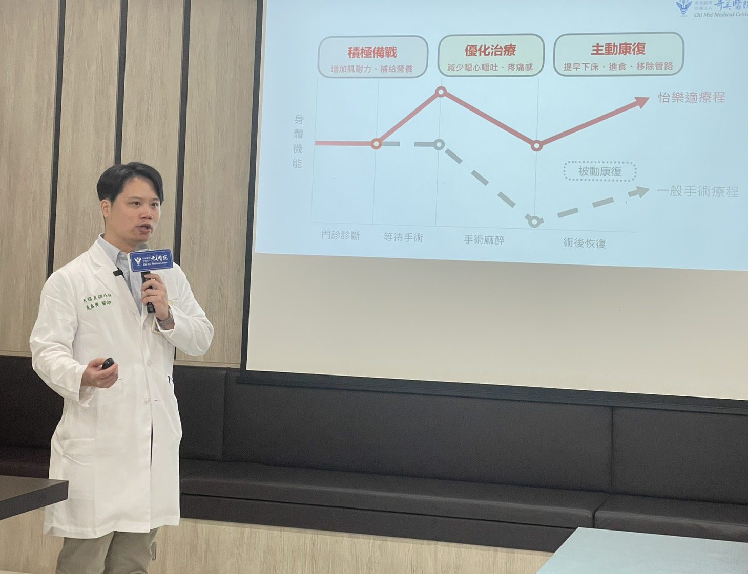 黃盈齊強調,奇美醫院怡樂適療程(ERAS)涵蓋了大腸直腸外科、麻醉部、復健科、營養科、呼吸治療科、護理部和藥劑部等跨專科團隊,並由個案管理師及行政支援人員協助,讓病人更「快」地恢復健康、術後狀況更「穩」定、整體過程更「安」全。