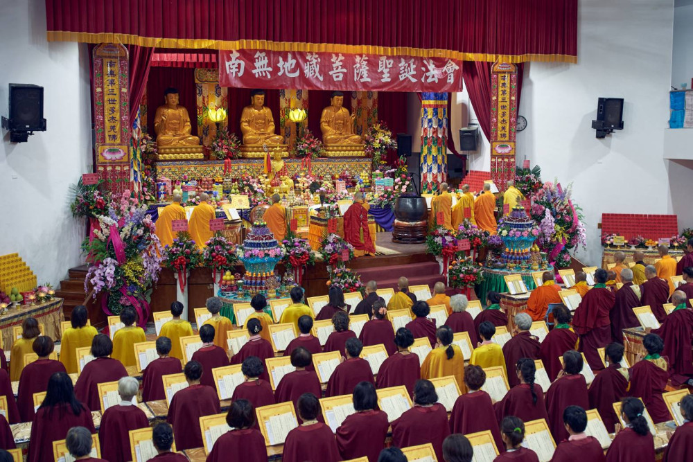 該會表示,地藏王菩薩發願救度一切罪苦眾生,被尊稱為大願地藏菩薩;南無地藏菩薩聖誕法會中恭誦《大乘金剛般若寶懺》及《地藏菩薩本願經》為主體,加上諸佛名號而成懺法,目的是以開啟般若智慧,斬破無明煩惱為修行法門,藉著法會上報親恩,誦經禮懺回向累世親友,並祈願國泰民安、世界和平、眾生幸福無災。(于郁金翻攝/中華國際佛教聞修正法會提供照片)
