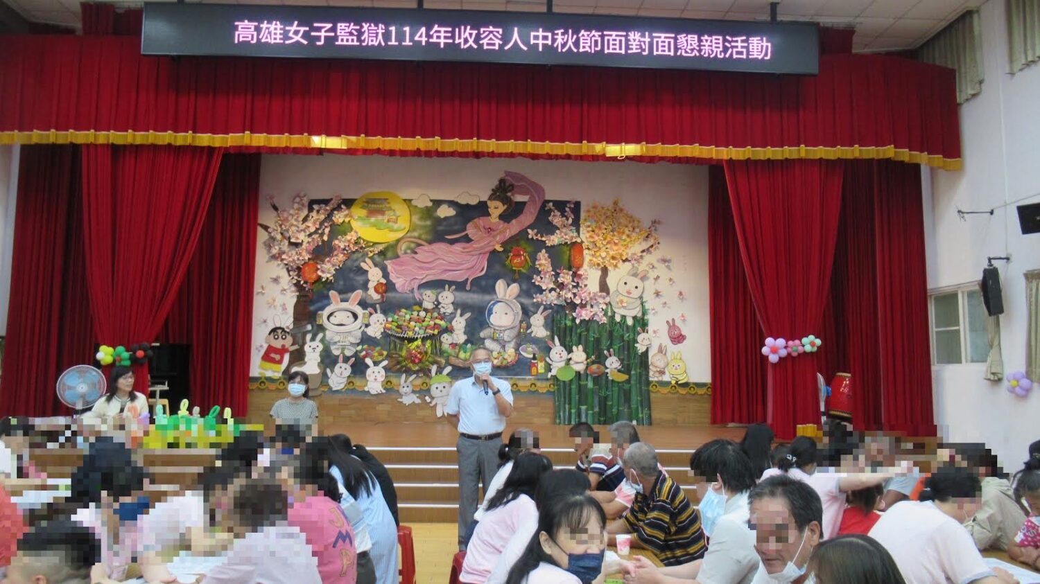 活動場地設於監內教誨堂,佈置以「月滿人團圓,兔趣慶中秋」為主題,由收容人手作的大型紙雕與環保素材拼組而成。畫面融合嫦娥奔月、玉兔、桂花與烤肉等節慶元素,搭配創意氣球班的繽紛裝飾,將監所空間轉化為充滿童趣與溫馨的團圓場景。孩子們在現場更收到兔兔造型氣球,笑聲此起彼落,為懇親會增添無數感動。