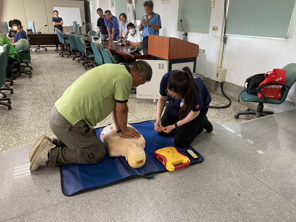 AED又被稱為「傻瓜電擊器」,是近年來公共場所必備重要急救設備;當有人突發心跳驟停時,黃金搶救時間僅有短短幾分鐘;若能即時使用AED,往往能在救護車抵達前爭取到寶貴救命機會;課程一開始,講師先透過簡報深入淺出地介紹心臟驟停成因、心肺復甦術(CPR)步驟,及AED正確操作方式;接著進行實際演練,讓同仁親手操作機器,熟悉電擊貼片放置位置、語音提示應對方法及啟動電擊流程。